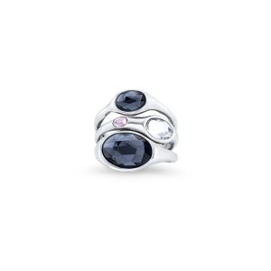 Metal alloy ring plated in sterling silver in the shape of an eye with a blue faceted crystal