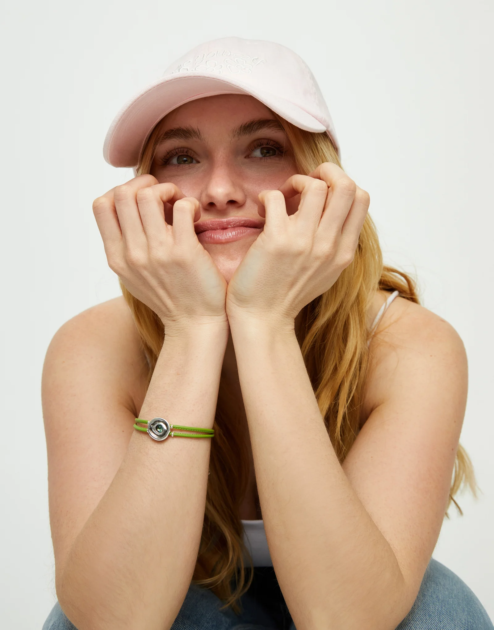 / Double green leather bracelet with a metal alloy eye detail pleated in sterling silver crystal