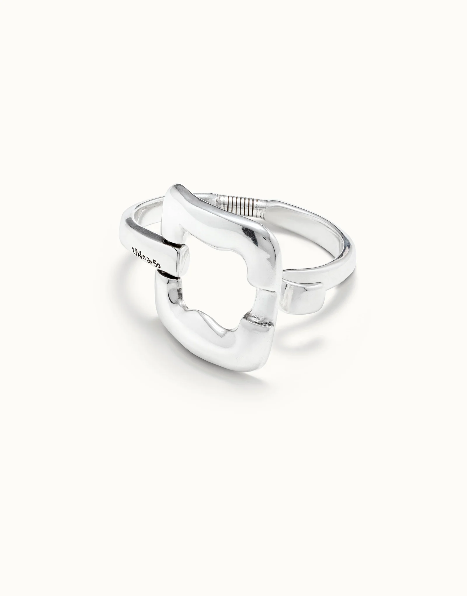 Bracelet in silver-plated metal featuring a large central squared link. It has a chic spring and a hook clasp that fastens to the link itself. This piece is handmade in Spain using artisan techniques. Get yourself this bracelet and wear it on any occasion.