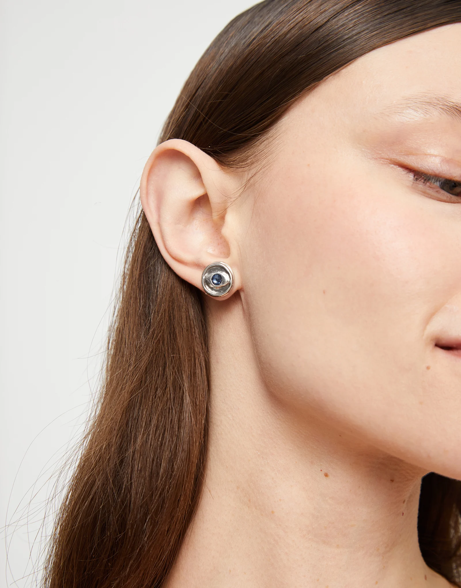 Metal aloy bottom earrings plated in sterling silver with a blue faceted crystal