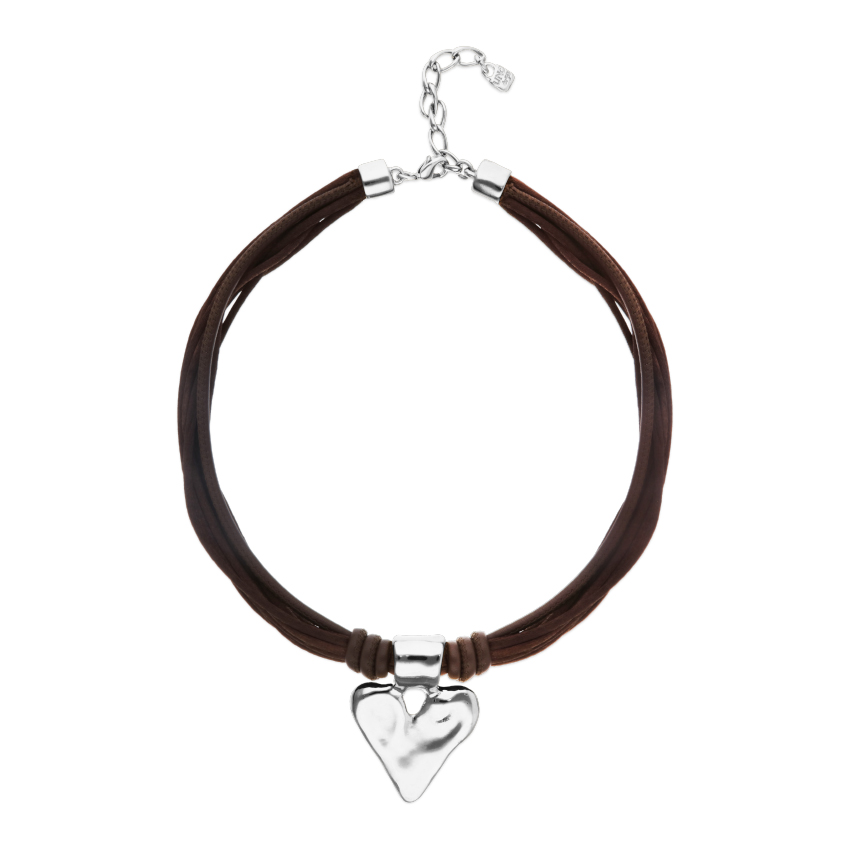 Mixed dark brown silk and leather thread necklace with sterling silver heart detail