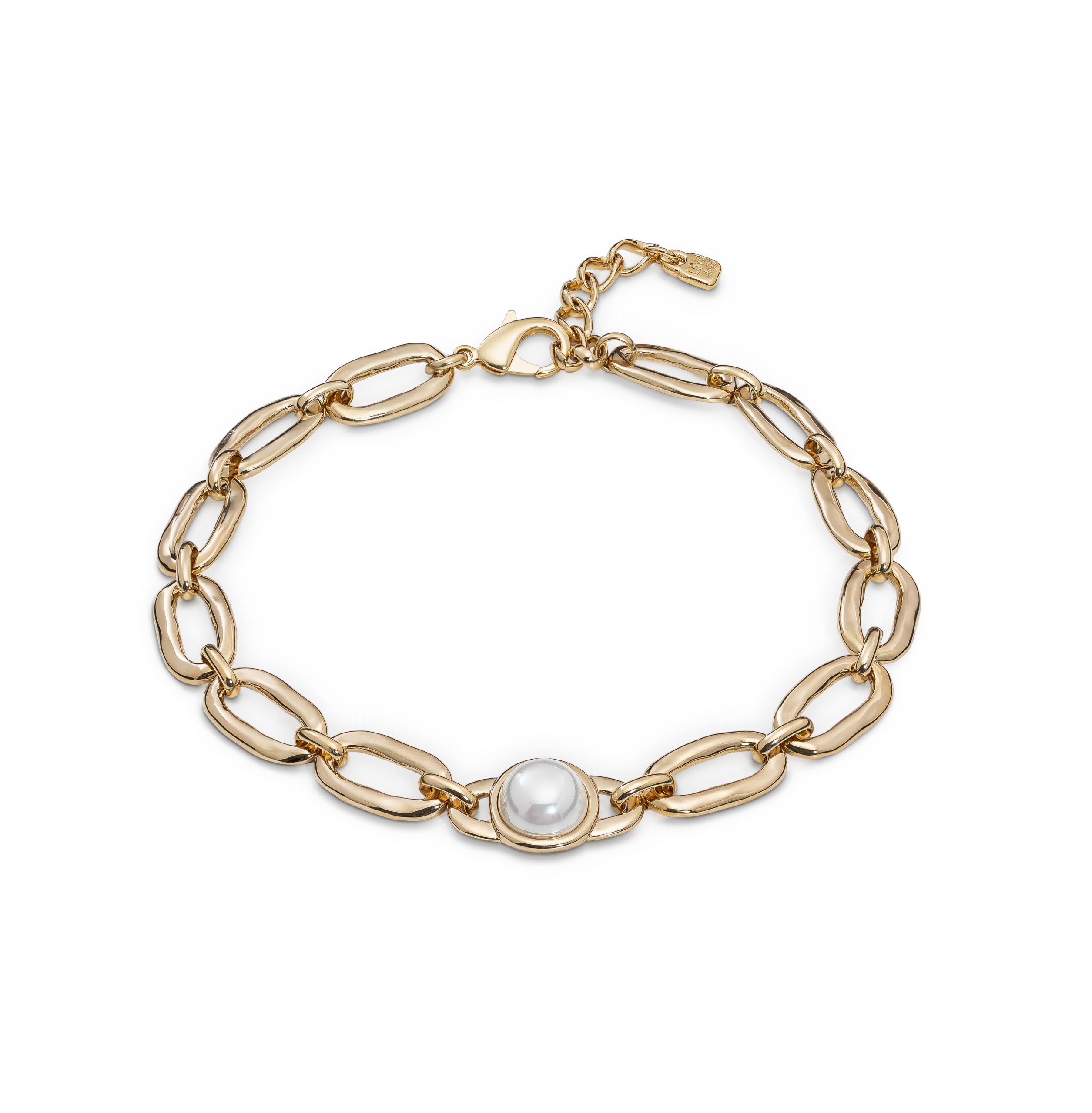 | Short necklace featuring large links and a central piece set with a pearl. It features a lobster clasp, allowing you to adjust this piece of jewelry to the desired length. This one-of-a-kind necklace is handmade in Spain from silver-plated metal using entirely artisan techniques. |