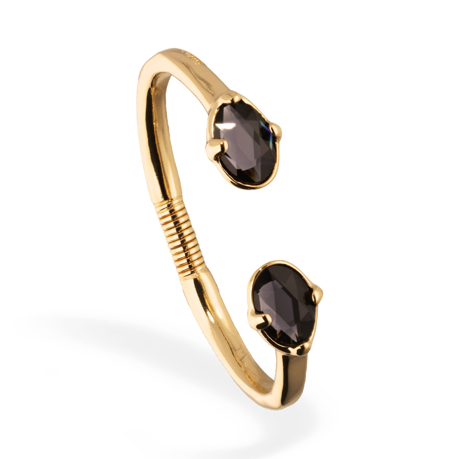 Rigid bracelet of metal alloy plated in gold 18k and grey faceted crystals at the ends