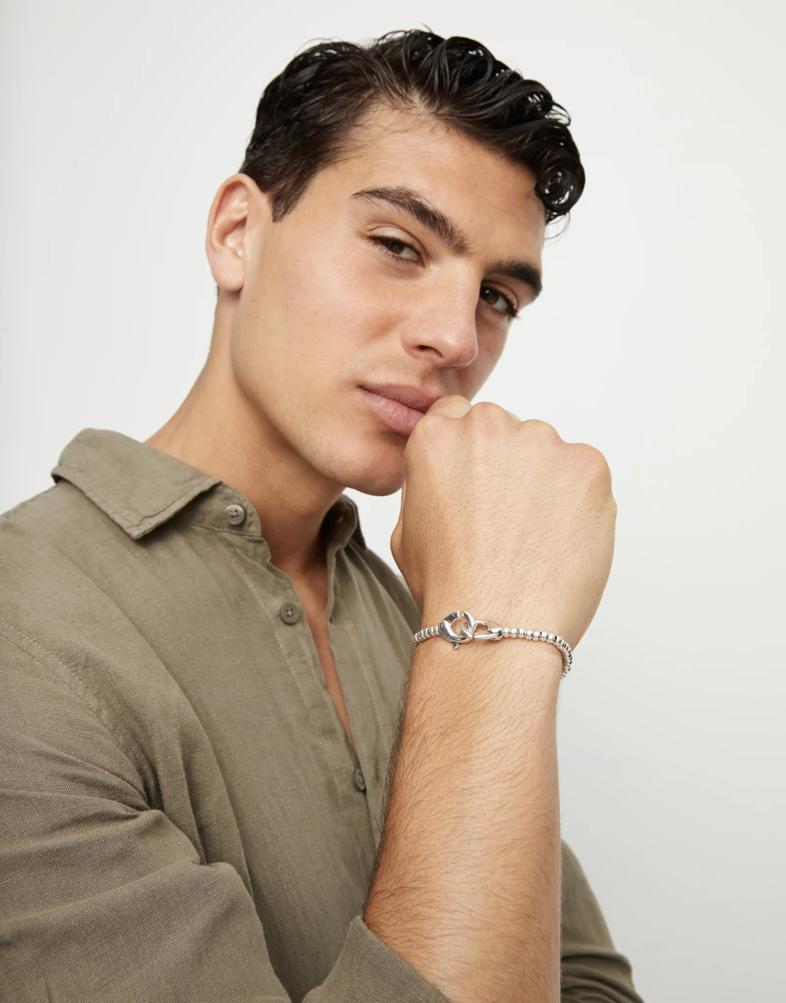 / Small beaded bracelet of metal alloy plated sterling silver with interlocked carabiner detail