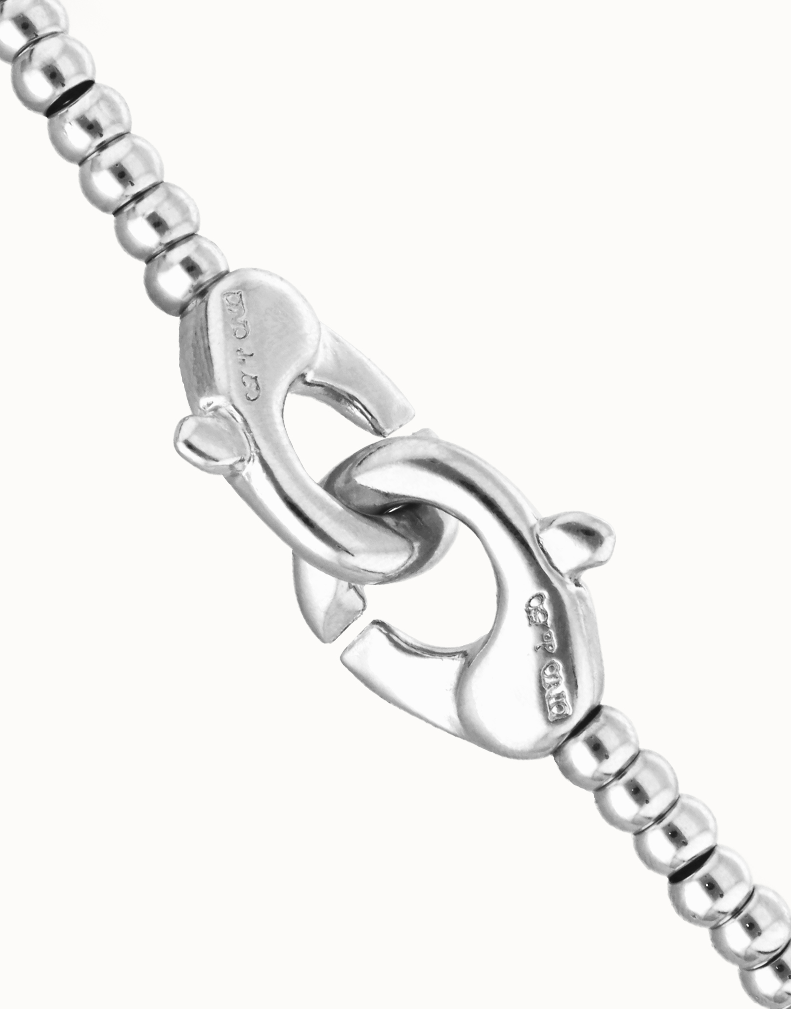 Small beaded bracelet of metal alloy plated sterling silver with interlocked carabiner detail